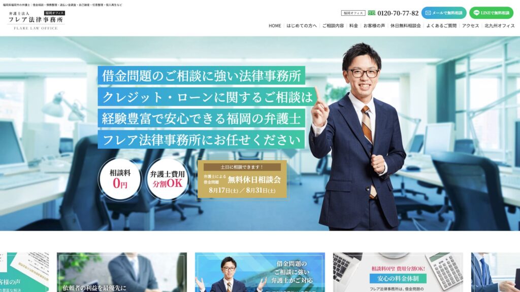 メインビジュアルに福岡市をイメージした写真と代表弁護士の写真を使用することで、親しみやすさと信頼性を高めています。
