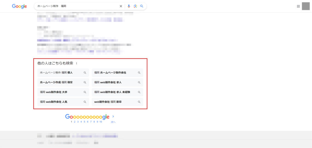 Google検索のサジェスト候補とは検索結果表示画面の下のほうに出てくる「他の人はこちらも検索」の部分のことです。