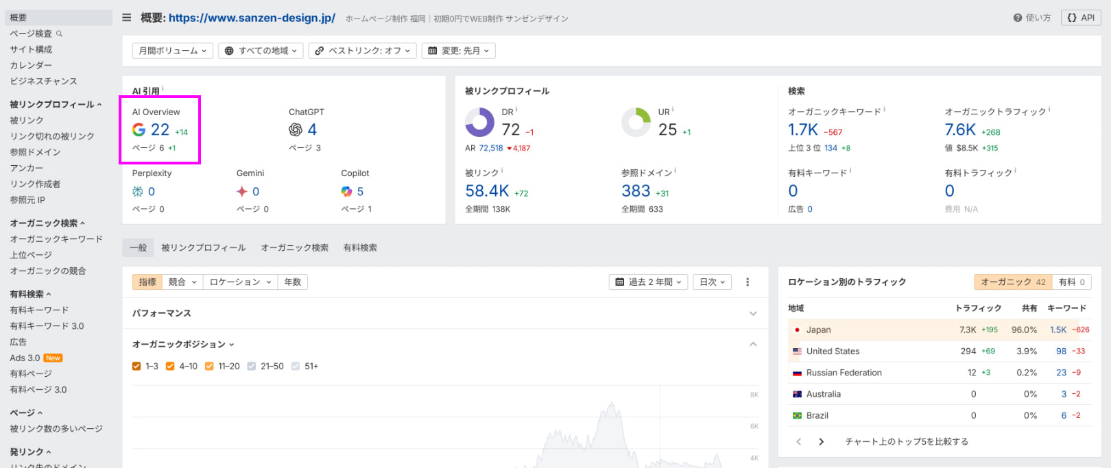 | 主要指標 | オーガニック流入数、検索順位、CTR | 指名検索数の増加、サイテーション数(将来的な指標)、 SEO指標の向上 |
