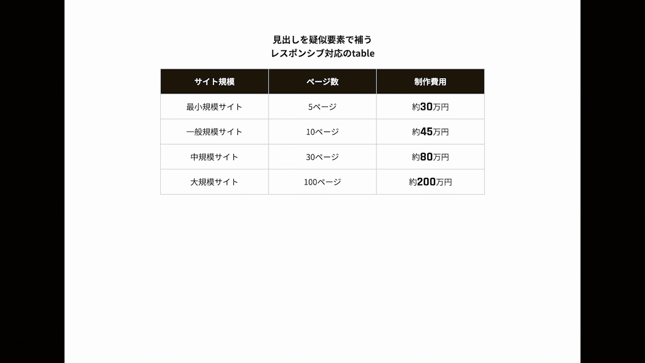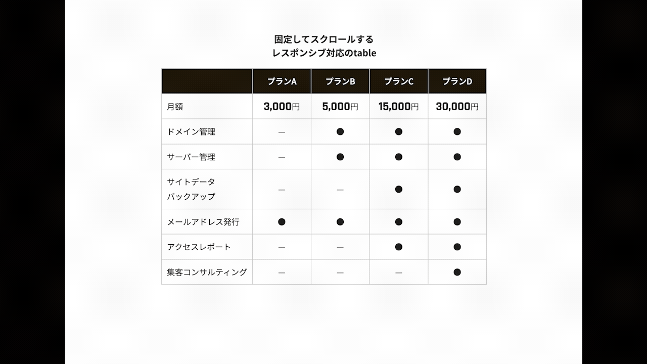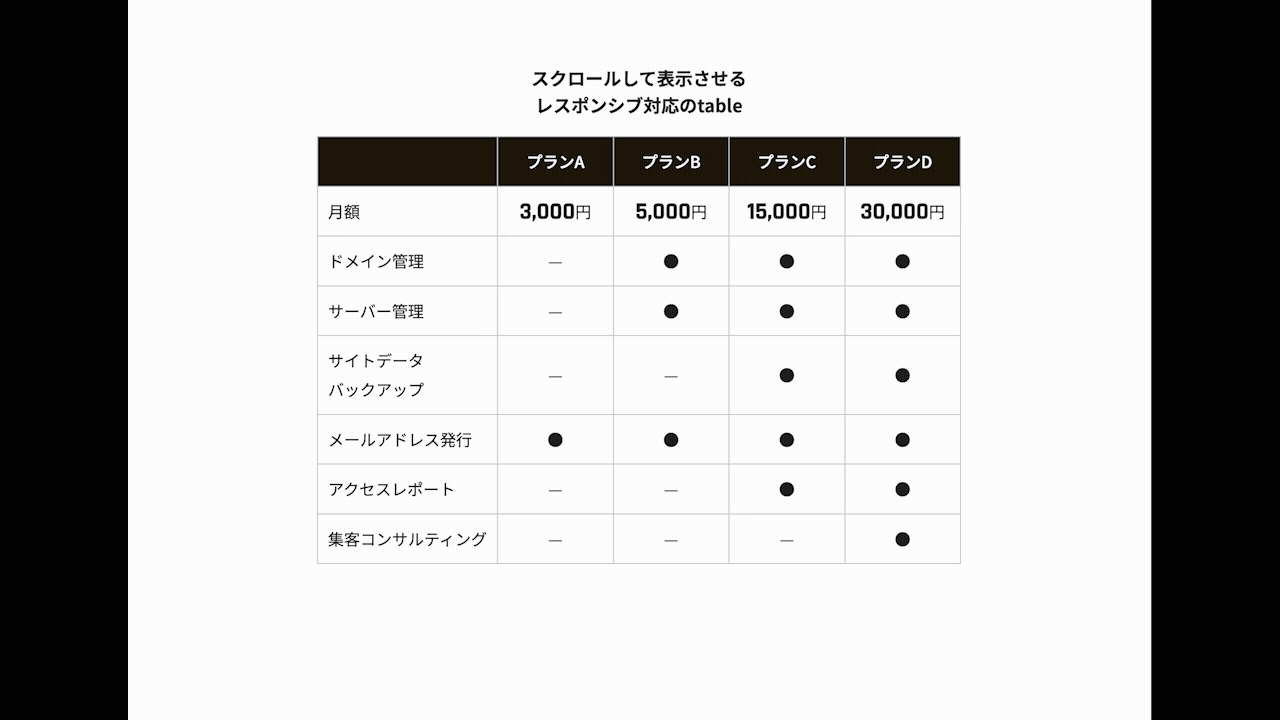 | 活用シーン | 項目数が多い料金表、比較表、スペック表など |