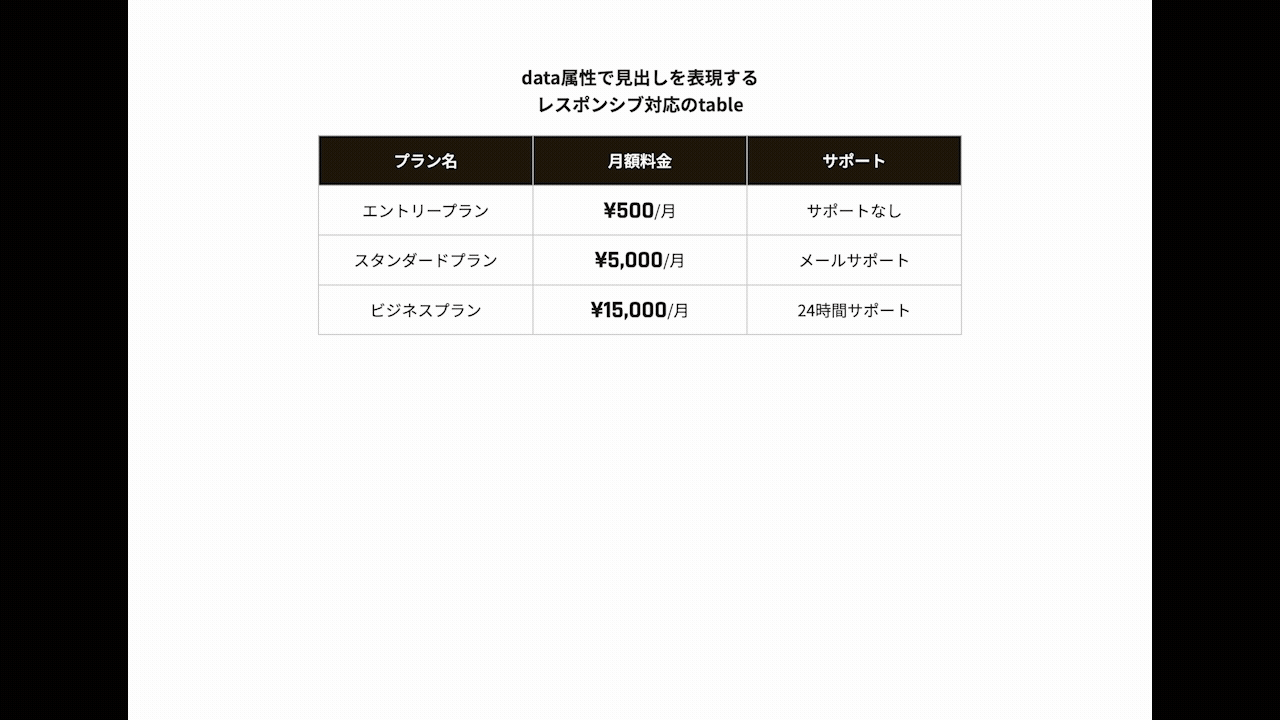 単に縦並びにするだけでは、「そのデータが何を意味するのか」が分からなくなってしまうテーブルもあります。そこで、CSSの疑似要素 ::before を使って、スマホ時のみ見出しを表示させる方法が有効です。